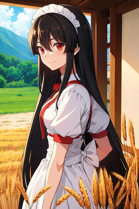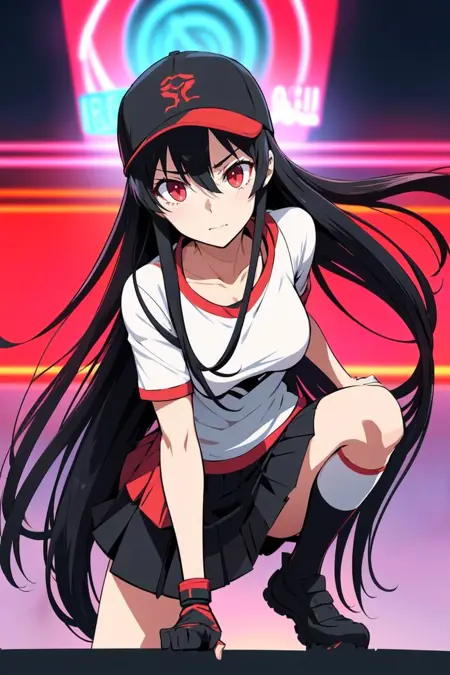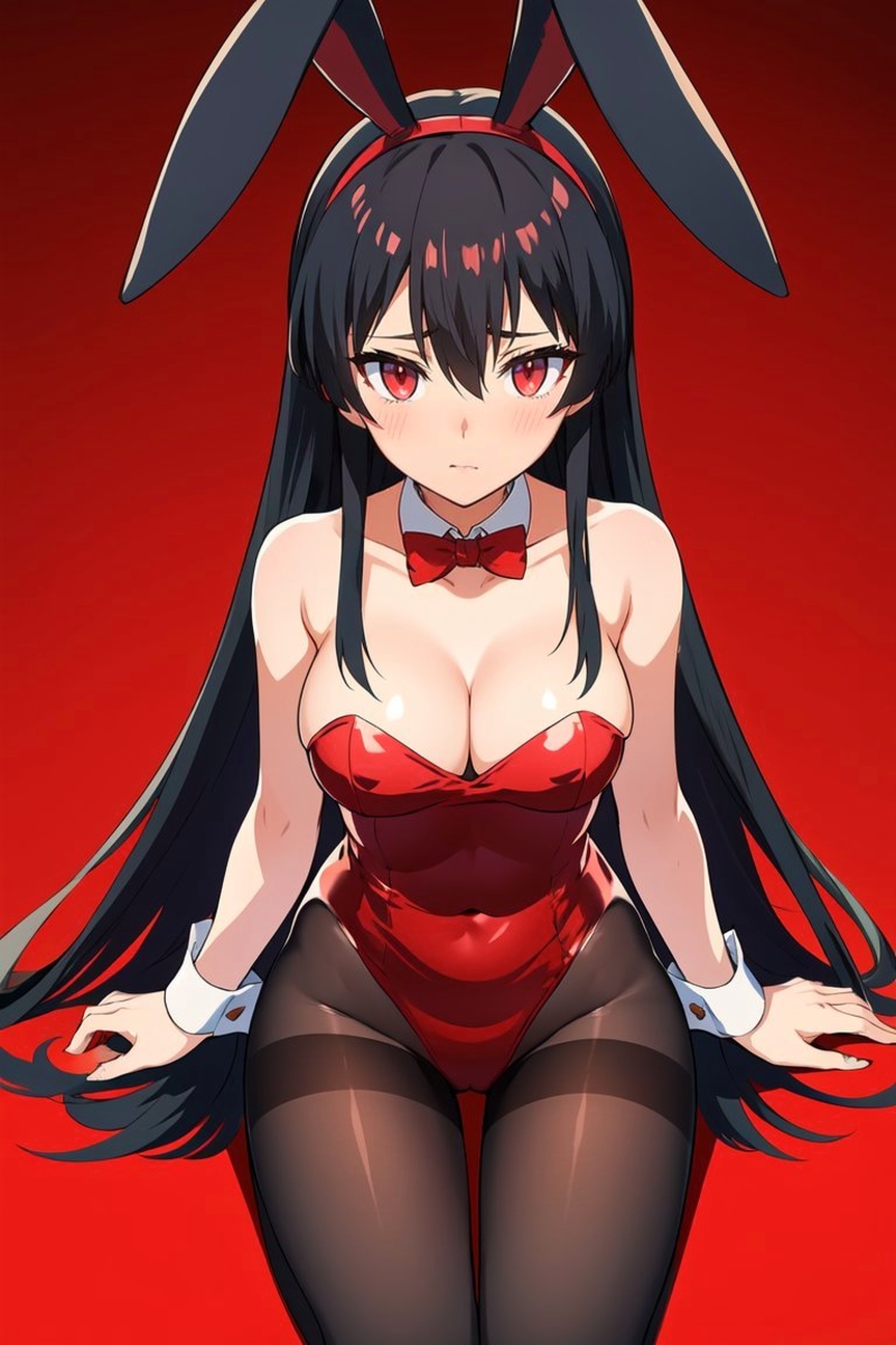 要「召唤她」,请使用「触发标签」加上以下标签:1girl, solo, long hair, black hair, red eyes, necktie, very long hair, looking at viewer, gloves, breasts