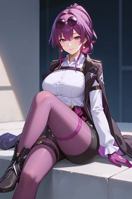 셔츠, 흰색 셔츠, 장갑, 보라색 눈, 긴 소매, 재킷, 선글라스, 팬티스타킹, 반바지, 보라색 장갑, 부츠, 검정 재킷, 허벅지 스트랩, 칼라 셔츠, 검정 신발, 검정 반바지, 보석, 코트, 어깨에 재킷, 귀걸이