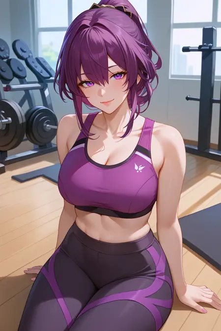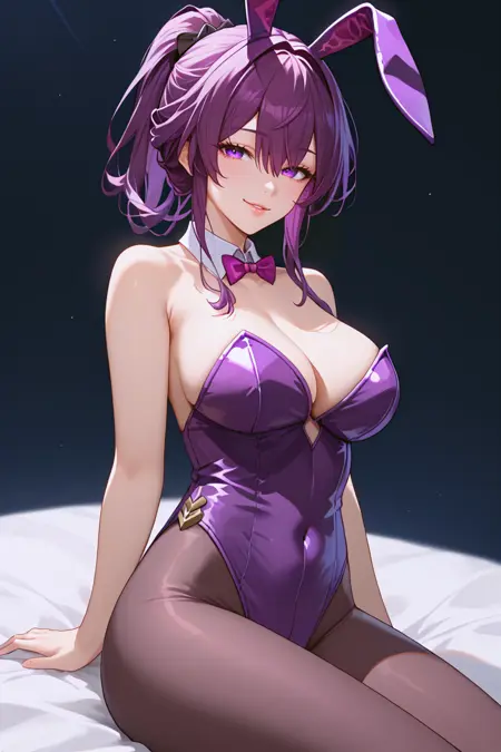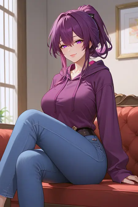 KafkaBren, 1girl, 보라색 헤어, 보라색 눈, 머리에 안경, 긴 헤어, 성숙한 여자, 눈 사이에 헤어, 팁테일, 입술, 유혹, 교활함, both_eyes_closed,