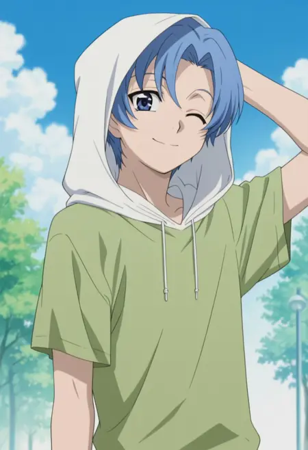 1boy, male focus, solo, blue eyes, blue hair, short hair, green hoodie, white hood, short sleeves, black pants,
