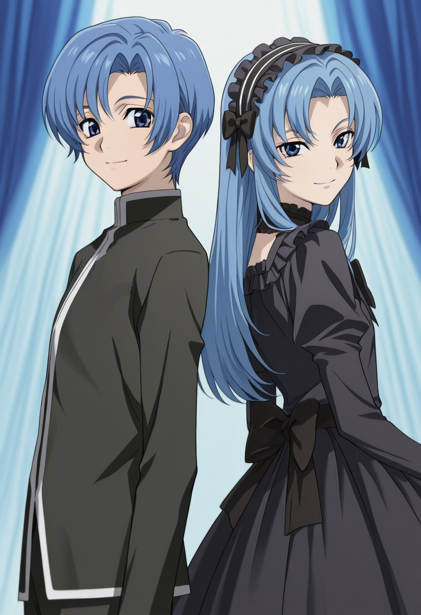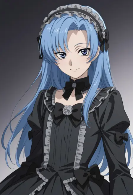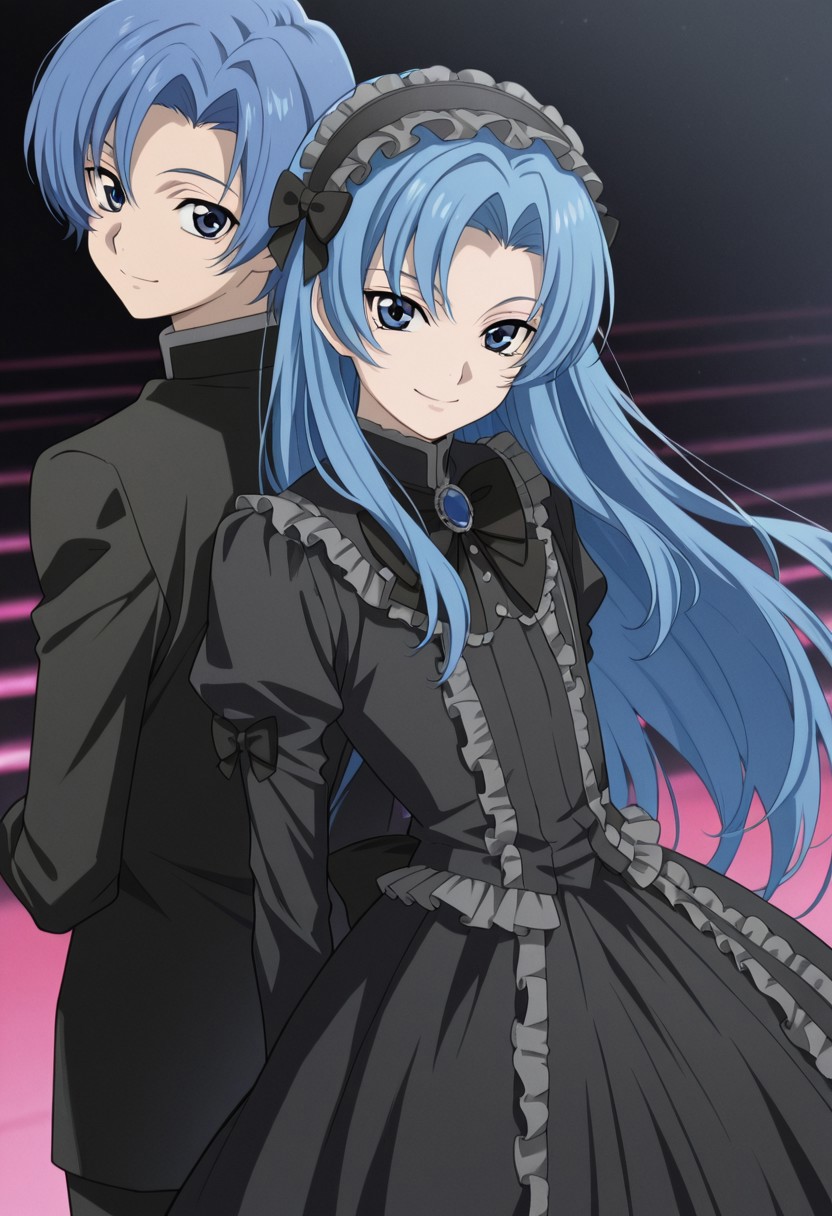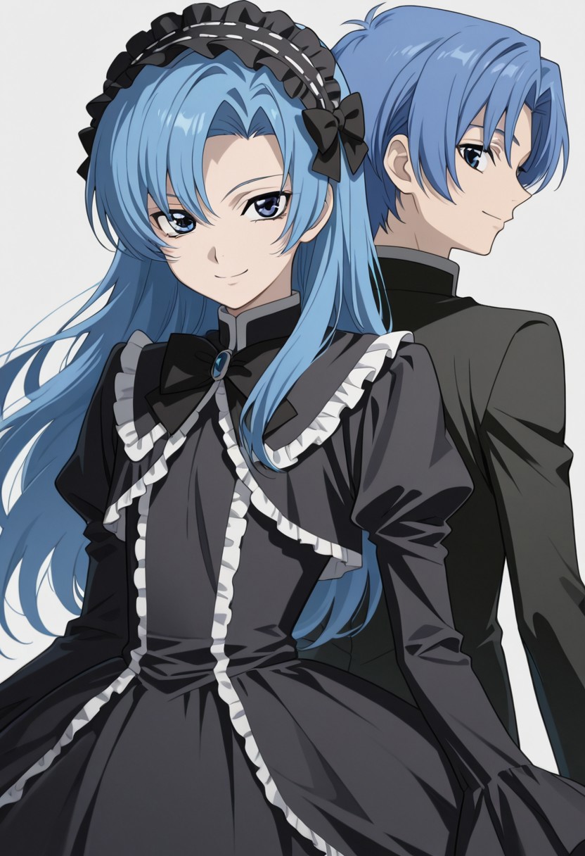 1boy, male focus, solo, blue eyes, blue hair, long hair, crossdressing, goth fascion, frilled hairband, black dress, black bow, frills,