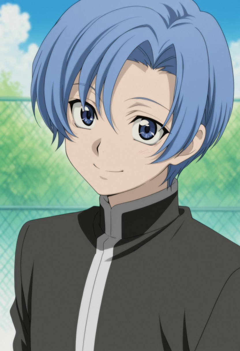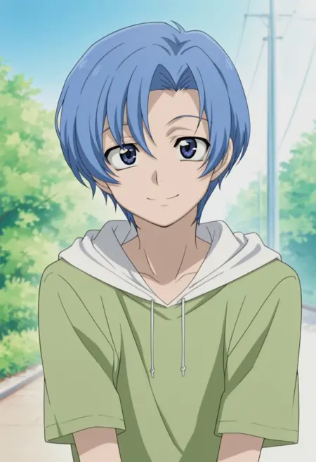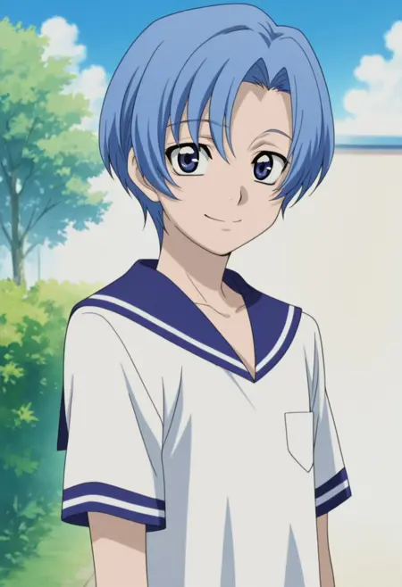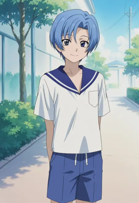 1boy, male focus, solo, blue eyes, blue hair, short hair, white shirt, blue sailor collar, short sleeves, blue shorts,