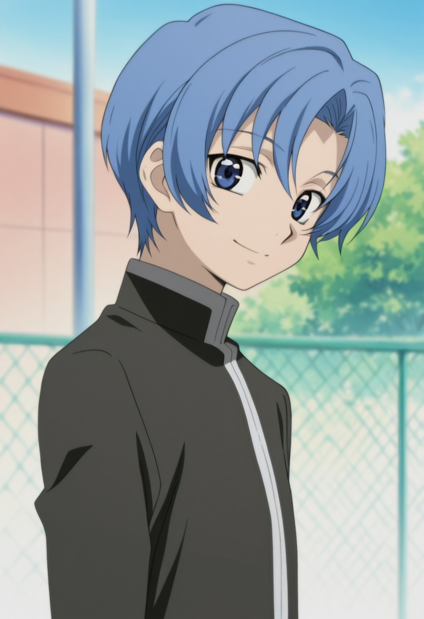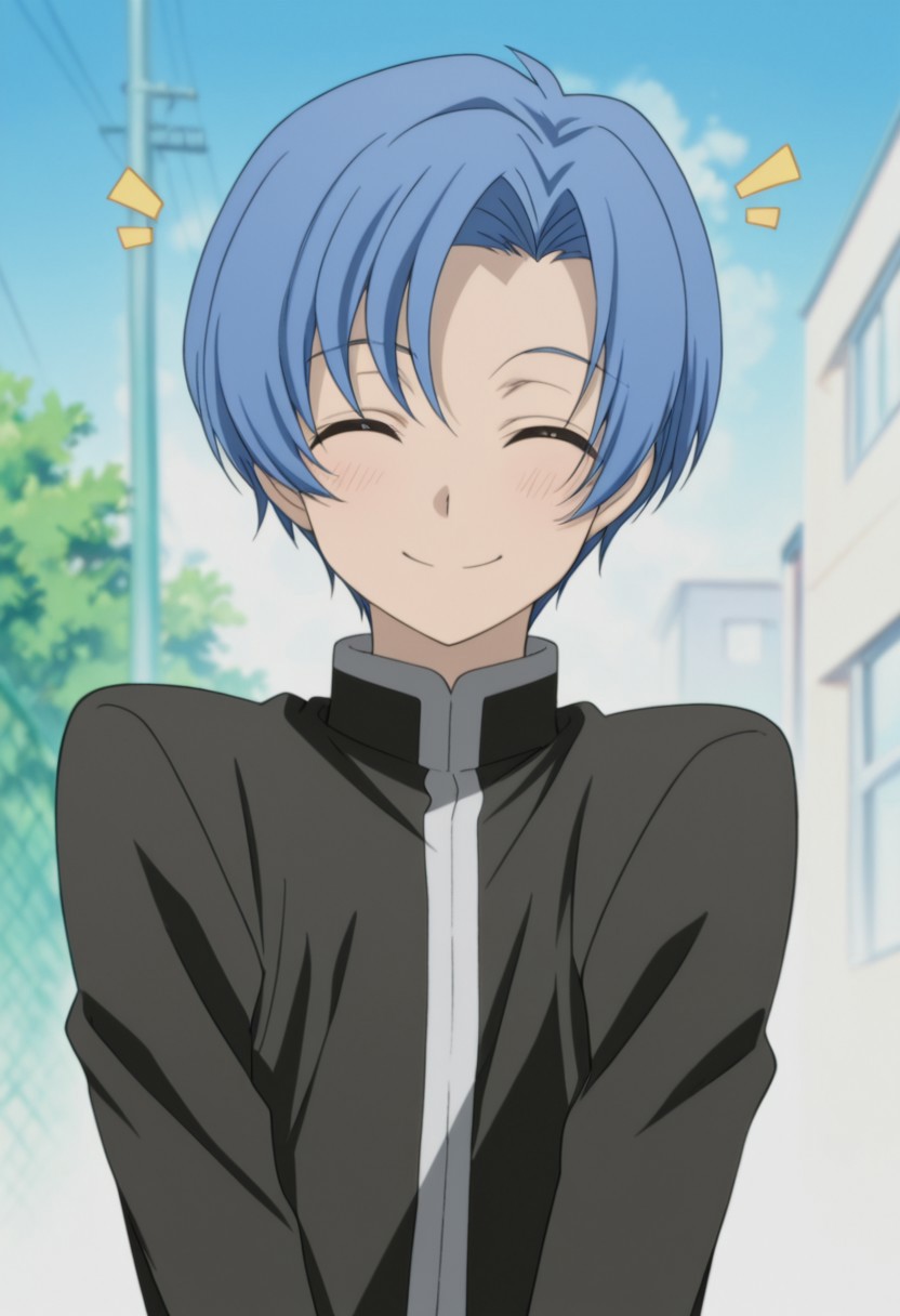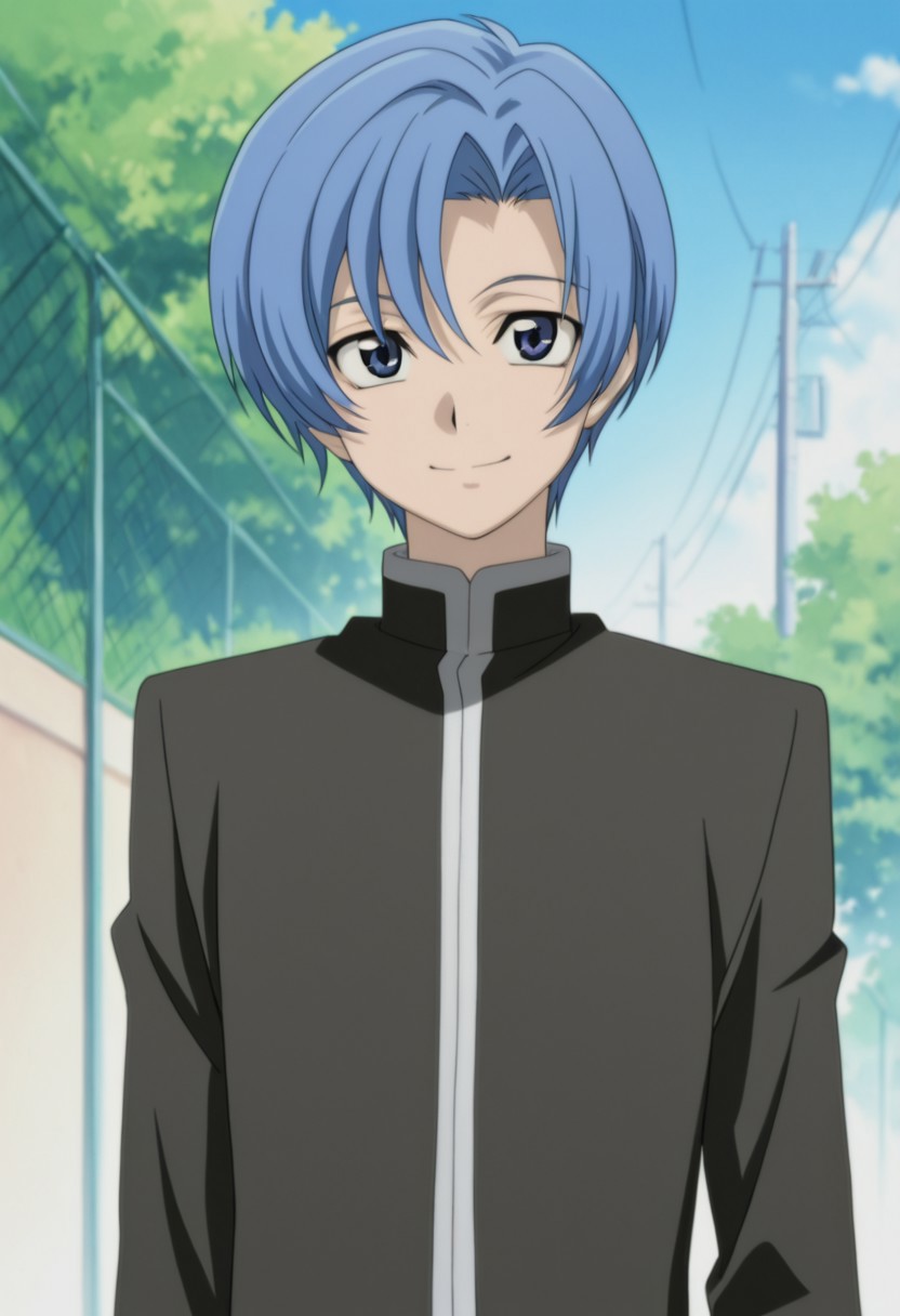 1boy, male focus, solo, blue eyes, blue hair, short hair, school uniform, gakuran, black jacket, black pants, black footwear,
