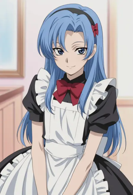 1boy, male focus, solo, blue eyes, blue hair, long hair, maid, hairband, black dress, puffy short sleeves, red bow, white apron,
