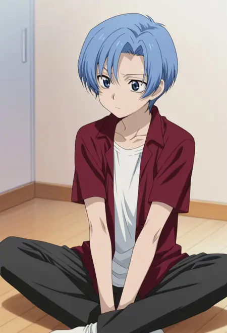 1boy, male focus, solo, blue eyes, blue hair, short hair, collarbone, white shirt, red shirt, collared shirt, open shirt, short sleeves,