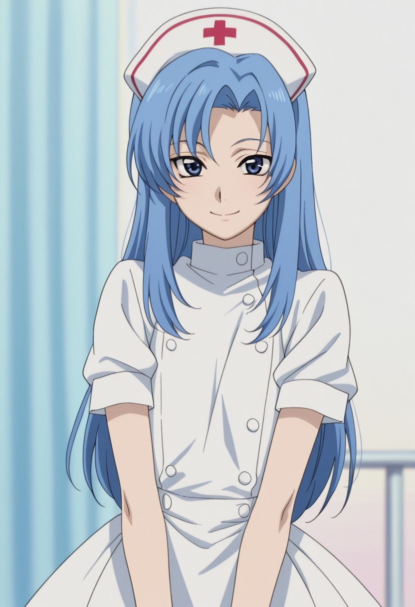 1boy, male focus, solo, blue eyes, blue hair, long hair, nurse, white dress, nurse cap,