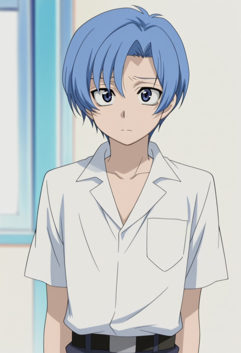 1boy, male focus, solo, blue eyes, blue hair, short hair, school uniform, collarbone, white shirt, collared shirt, short sleeves, belt, black pants,