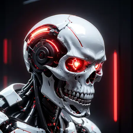 正向提示词a divin and futuristic Skull on display made of glossy white and red glow tech, delicate frame, cyborg, deus ex human revolution, WhiteEmber, masterpiece, best quality, highly detailed, sharp focus, dynamic lighting