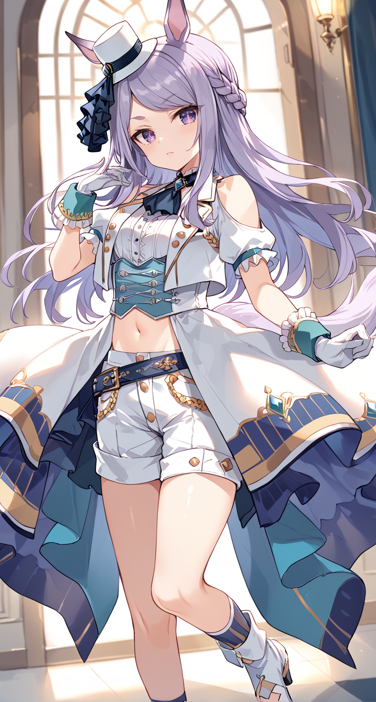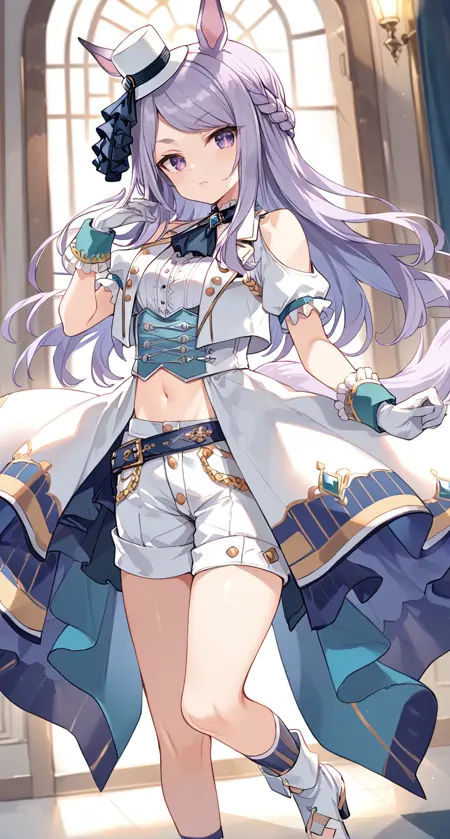 白い靴、白い帽子、馬の尾、尾、太もも、手首のカフス、ショートパンツ、白いショートパンツ、
