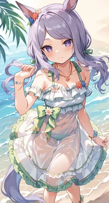 紫瞳、紫髪、透け感、透け感のあるドレス、水着、尾、ツインテール、ドレス水着、
