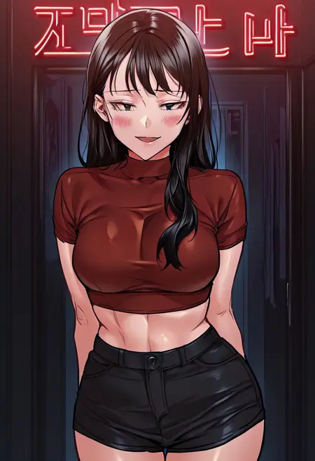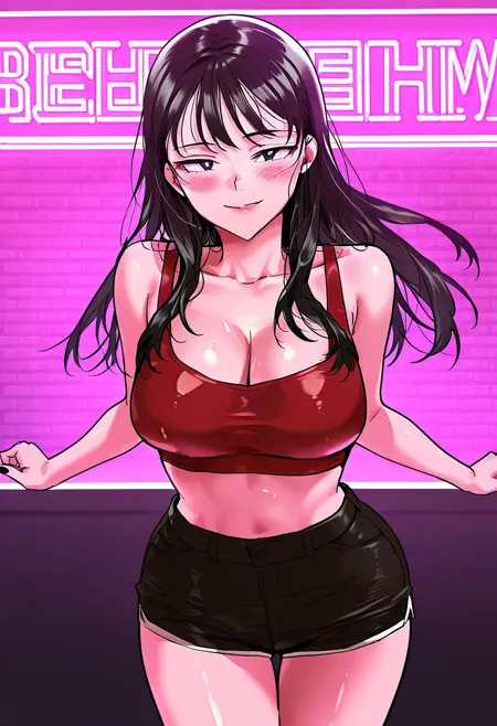 1. ((性感露背红色短上衣,露骨的胸脯,巨大的胸脯,露腹,性感黑色短裤,黑色项圈,性感短款半裤腿黑色渔网袜))