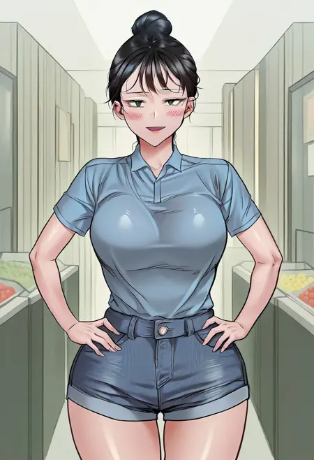 7. ((深蓝色领T恤,牛仔短裤,)) + 粉色运动鞋