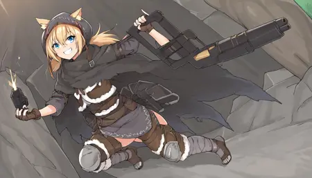 座っている、銃を撃つ、かがんでいる、全身ショット
