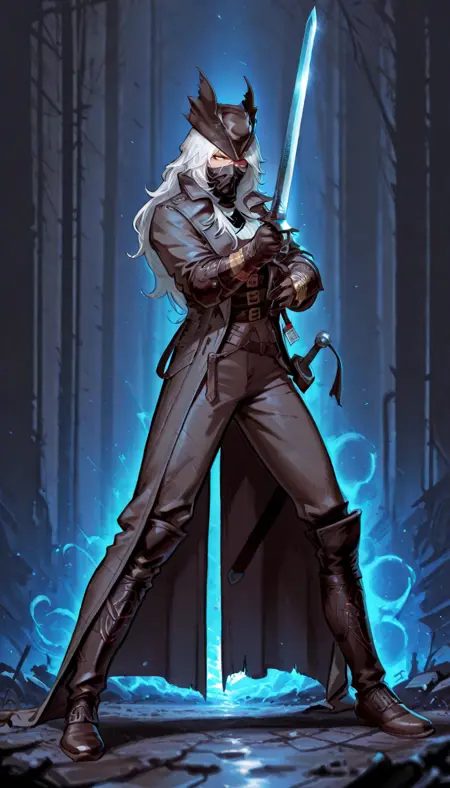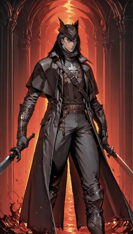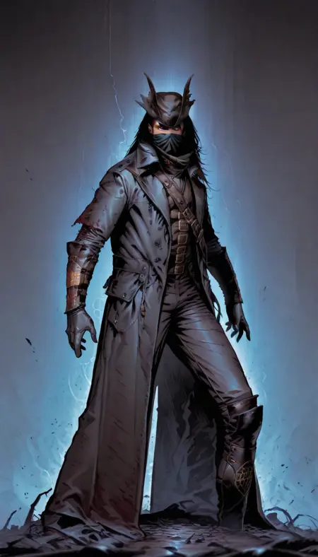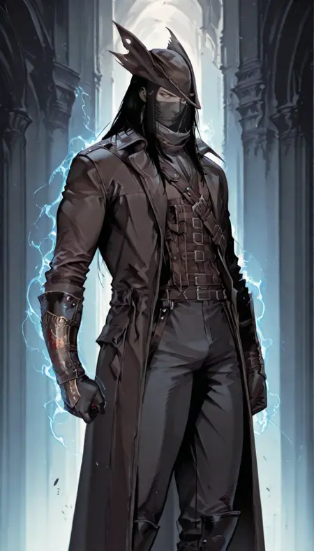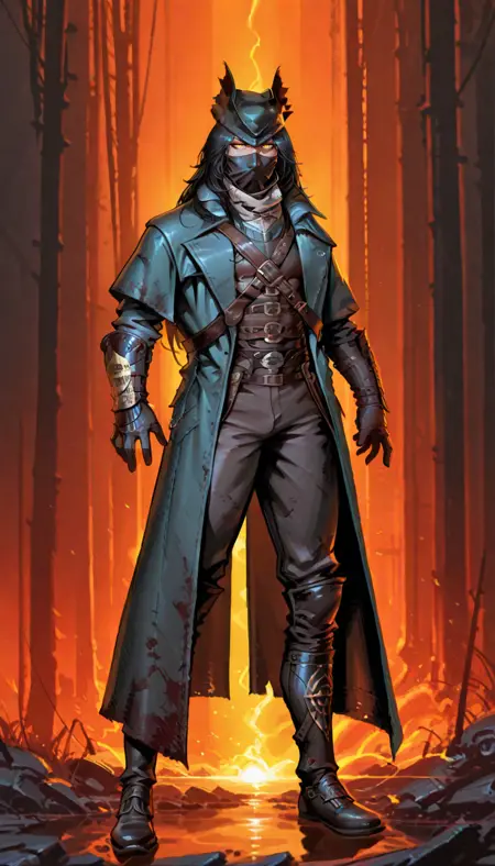 bborn, leather coat, long coat, leather pants, hunter hat, hunter garb, hunter gloves, hunter trousers, facemask, hat,