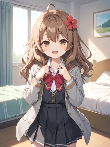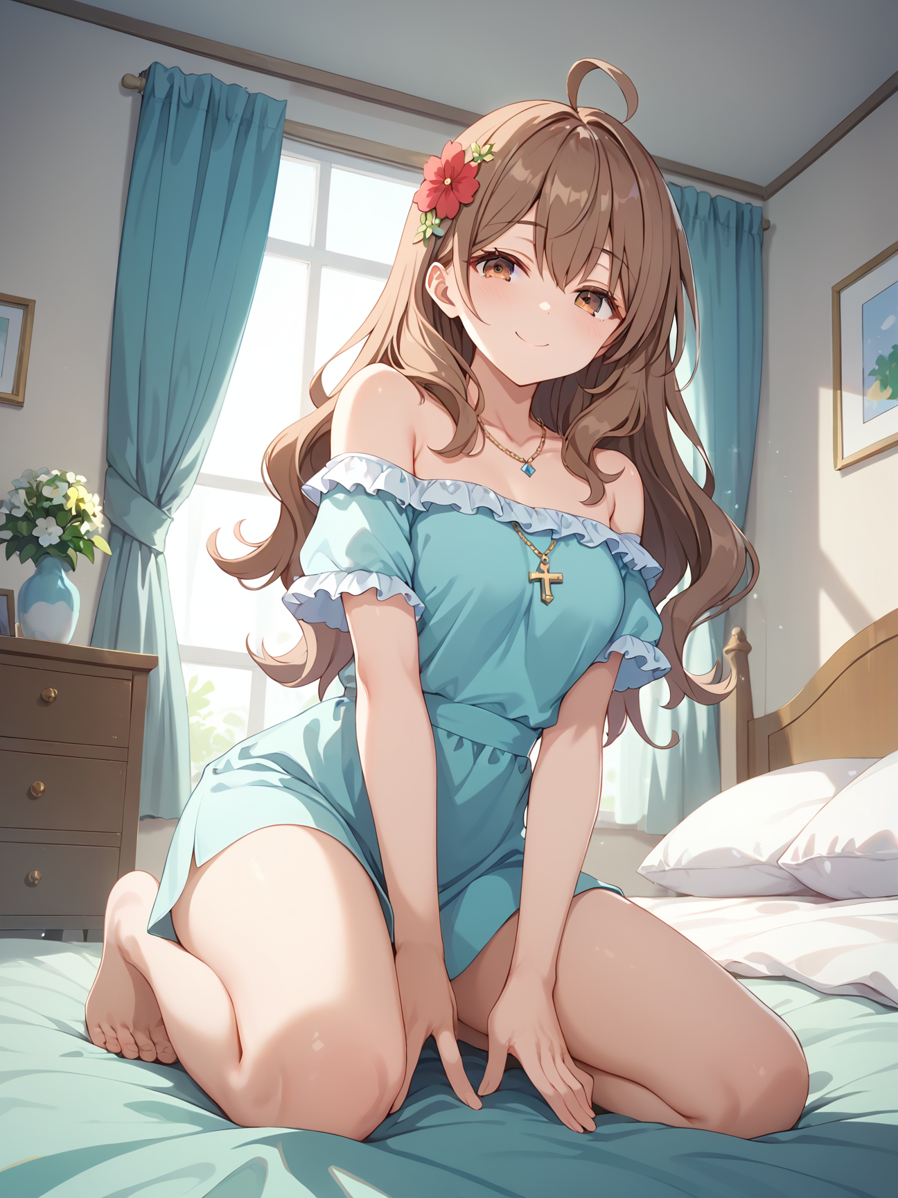 masha_ane, brown eyes, brown hair, hair flower, long hair, ahoge,