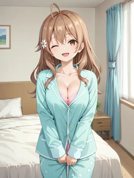 masha_ane, brown eyes, brown hair, hair flower, long hair, ahoge,