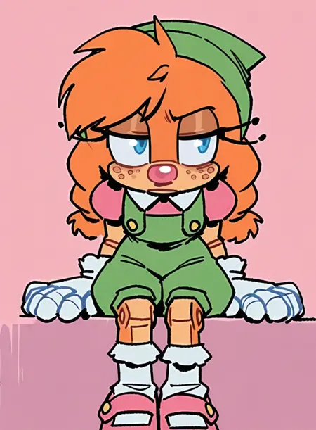 green headwear, white gloves, white socks, pink footwear, mary janes, green overalls, overall shorts, puffy short sleeves, collared shirt, pink shirt