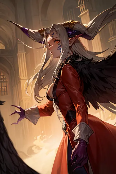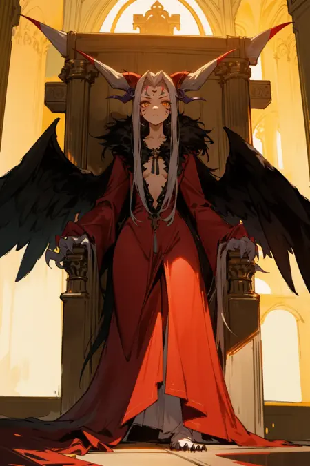 特徴的な姿にするために、「horns, red dress, plunging neckline, feather trim, black wings, facial marks, claws」を追加してください。