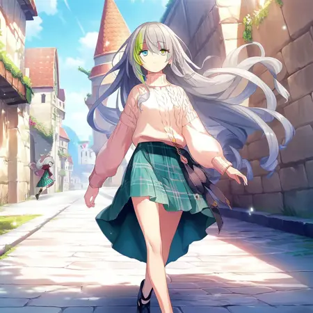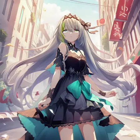 トリガーワード:Milva_Lindemann_DEEP_ONE、ヘテロクロミア、黄色の目、緑の目、ストライプ入りの髪、シルバーの髪、長い髪