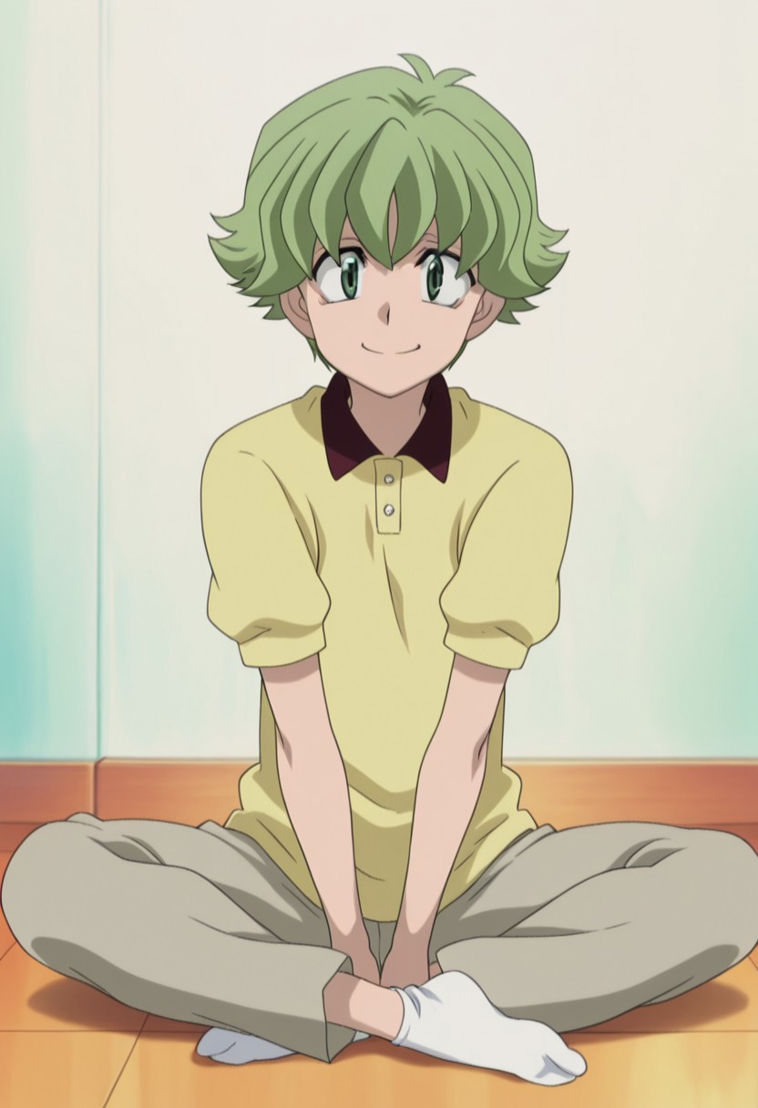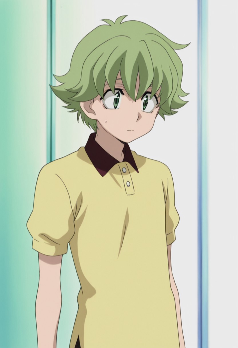 1boy, male focus, solo, green eyes, green hair, short hair, polo shirt, yellow shirt, short sleeves,