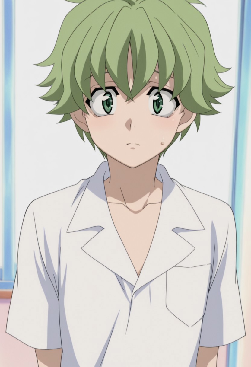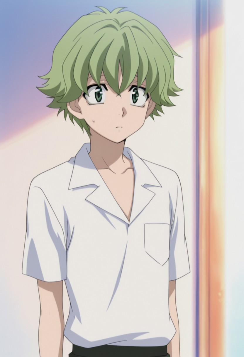 1boy, male focus, solo, green eyes, green hair, short hair, school uniform, white shirt, collared shirt, collarbone, short sleeves, belt, black pants,