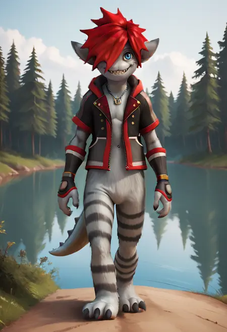 1boy, furry, s0r4, red hair, blue eyes, tail, hair over one eye, jewelry, jacket, sharp teeth