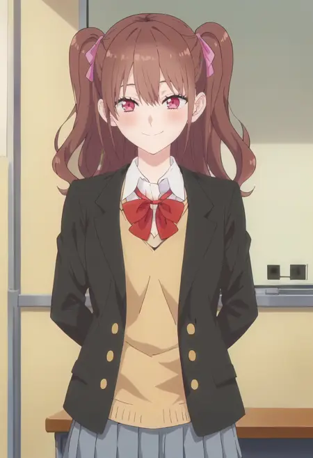 옷 1: 학교 유니폼, 리본, 재킷, 빨간 넥타이, 흰 셔츠, 빨간 리본, 칼라 셔츠, 넥타이, 빨간 리본, 목 리본, 윙 칼라