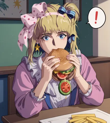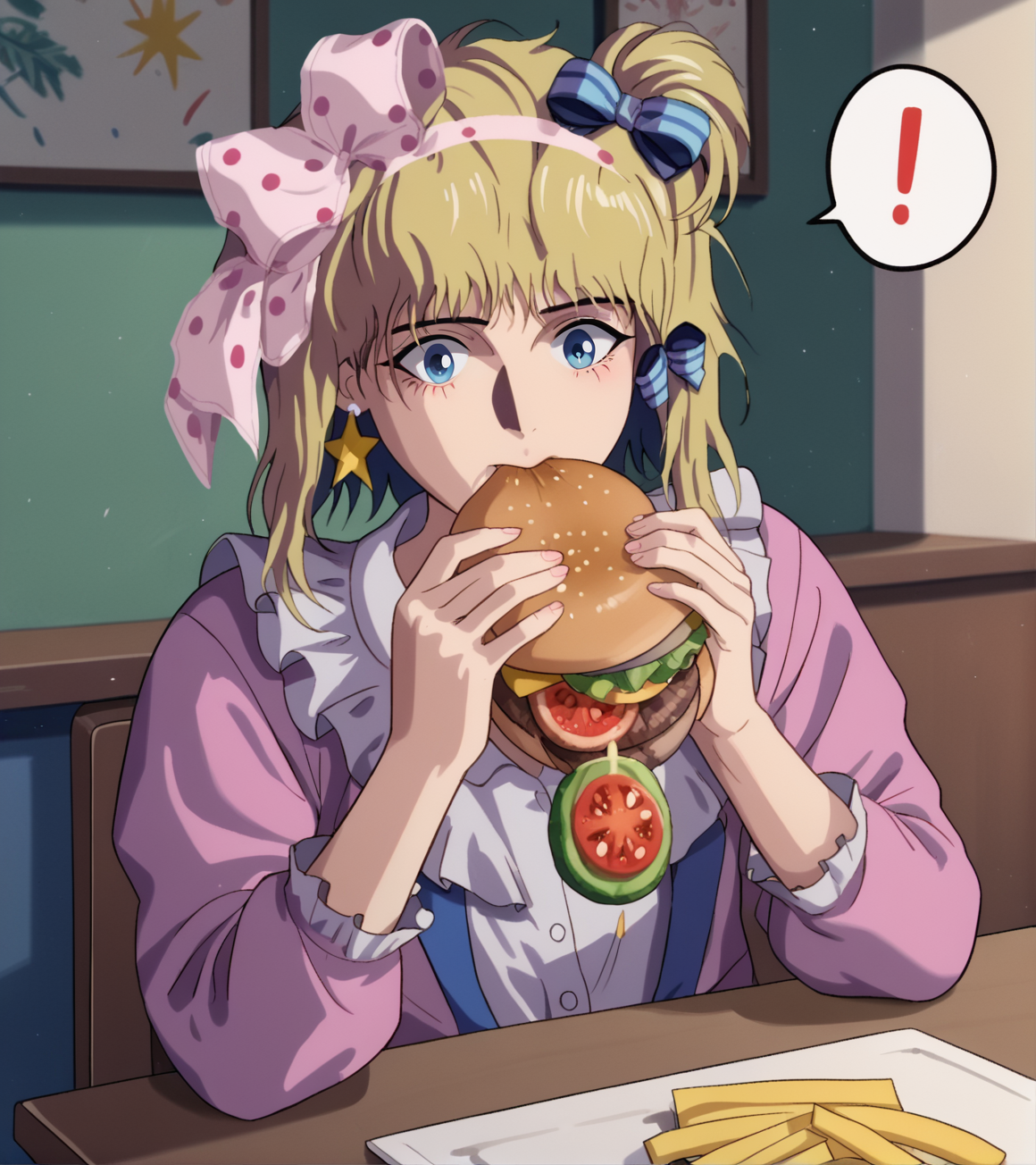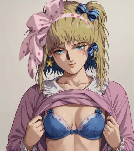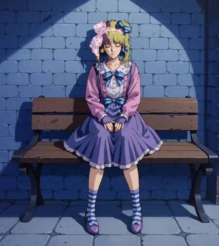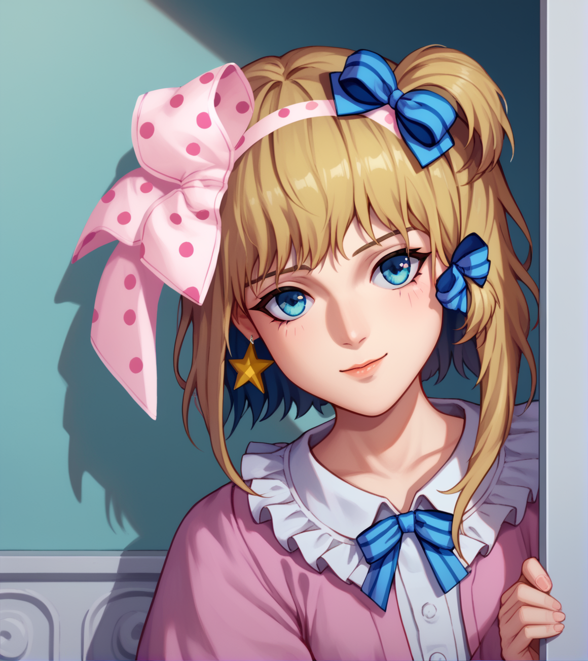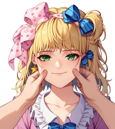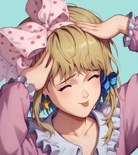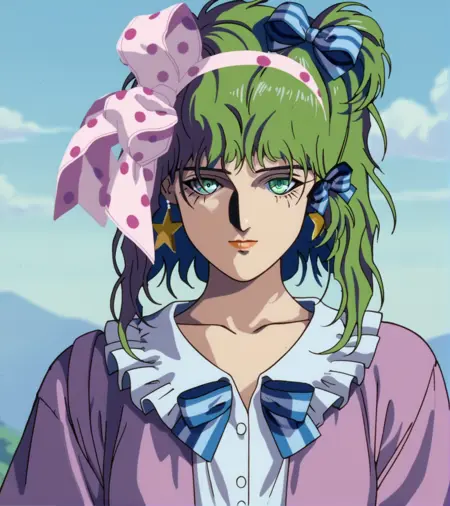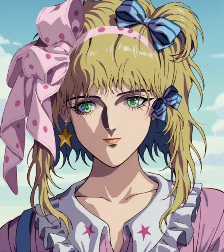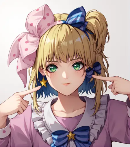 标签:金色头发,绿色眼睛,一条条纹袜子,粉色波点蝴蝶结,紫色拖鞋,星星耳环,星星图案,蓝色发带,红色指甲,无指手套,带有星星的紫色层叠裙子,