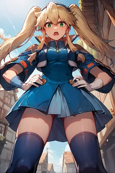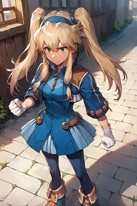 klarissa3, blue_jacket, pleated_skirt, blue_thighhighs,white_gloves, shoes,hairband,ribbon, blonde_hair, twintails, low-tied_sidelocks,