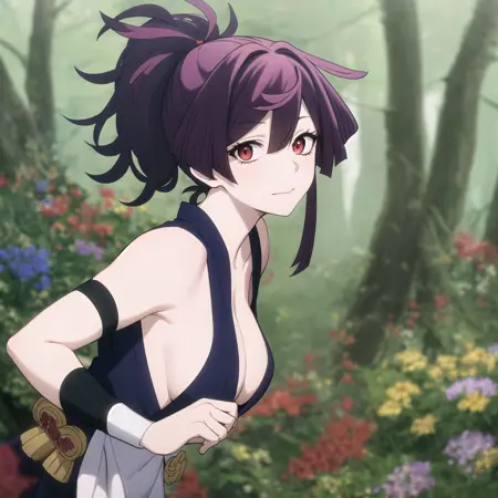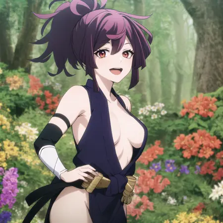 red eyes, purple hair, ponytail, cleavage, ninja, japanese clothes, bare shoulders, hip vent