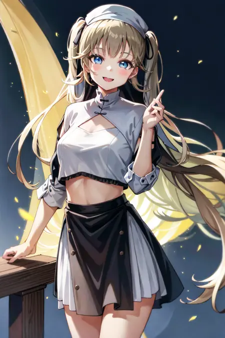 skirt, shirt, gloves, ribbon, hair ribbon, frills, black gloves, miniskirt, hair bun, crop top, double bun, black ribbon, white skirt, single thighhigh, half gloves