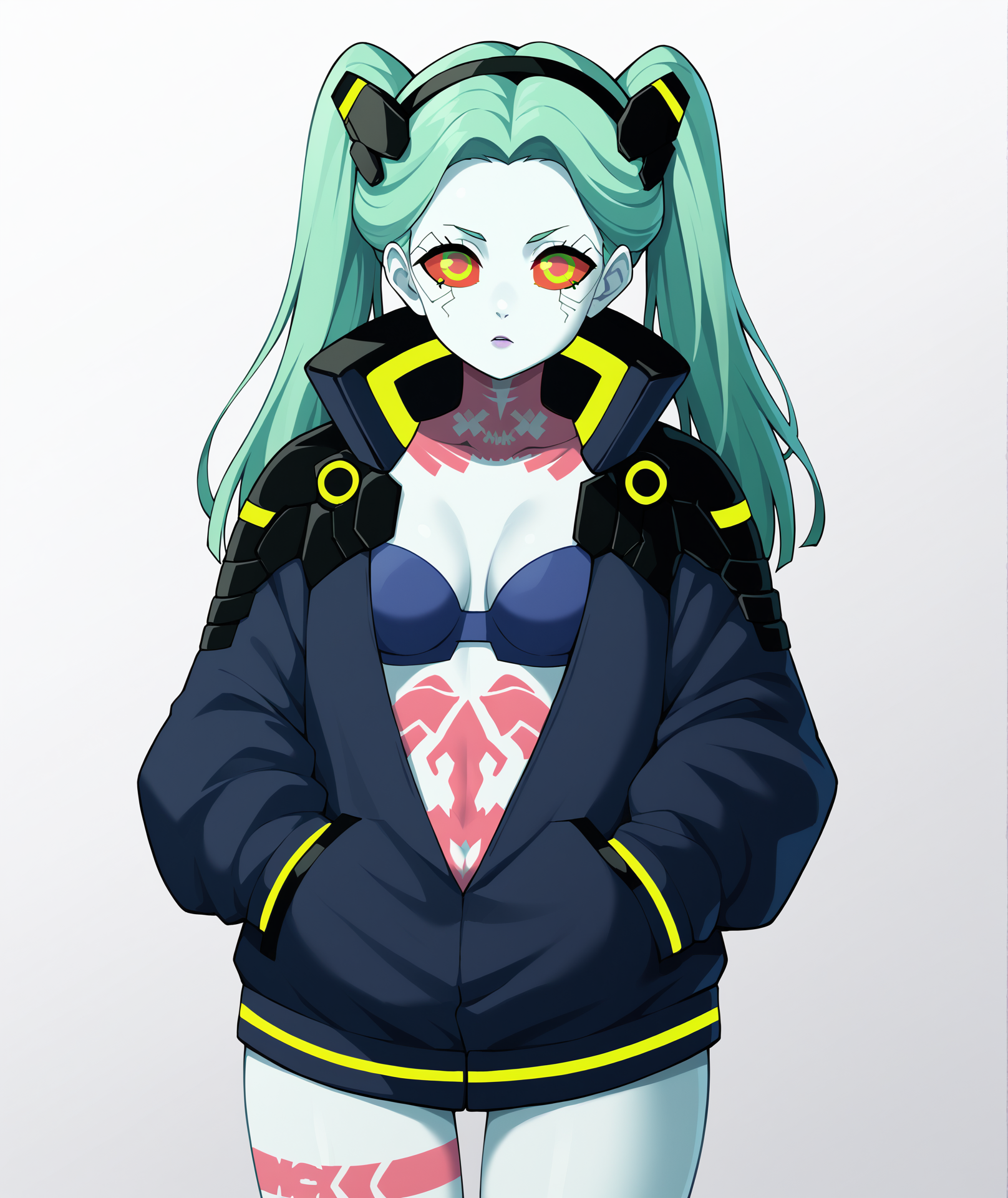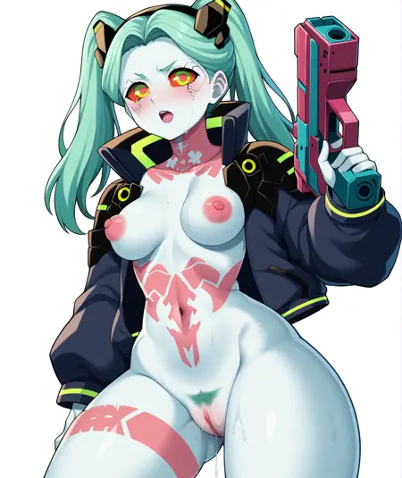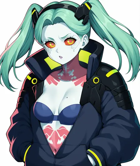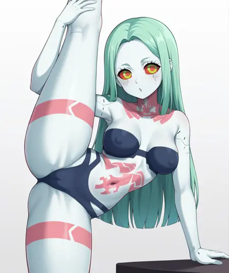 長い髪、赤い目、緑の目、緑の髪、タトゥー、色つき肌、ストレートヘア、色つき巩膜、白い肌、サイボーグ、足のタトゥー、お腹のタトゥー、赤い巩膜、赤い瞳、首のタトゥー、人工の目、メカニカルな目