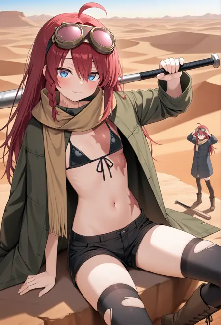 | トレーニングワード | kazuuchi_ataru, long hair, blue eyes, hair between eyes, bangs, flat chest, ahoge, コピーしました! shorts, thighhighs, black bikini, bikini,swimsuit, goggles, torn clothes, boots, front-tie bikini top, front-tie top, short shorts, red hair, navel, black thighhighs, coat, goggles on head, black shorts, braid, open clothes, torn thighhighs, jacket, bikini top only, brown footwear, scarf, midriff, stomach, コピーしました! baseball bat, holding,コピーしました! |
