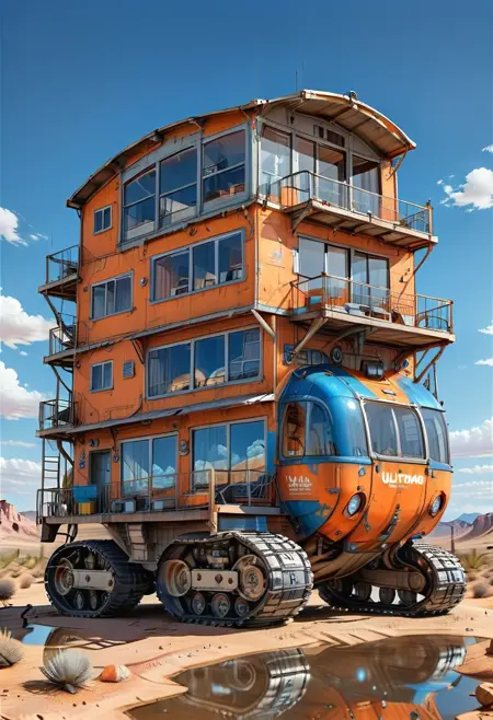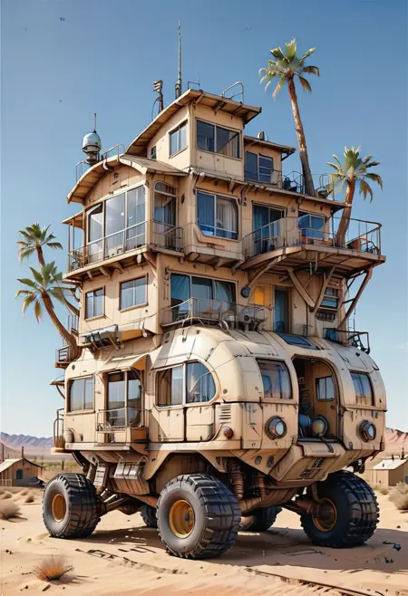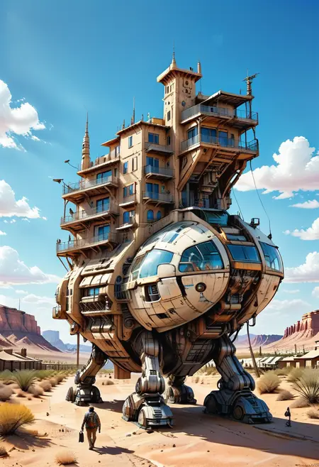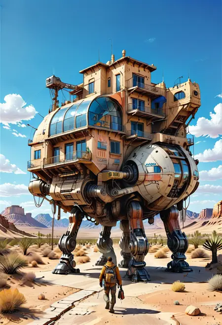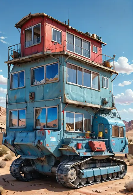 このLoRAを使用して、サイエンスフィクションスタイルやスチームパンクスタイルなど、さまざまな牽引都市、ウォーカー車両、履帯車両、脚式車両、車輪付き建物、脚付き建物を作成できます。
