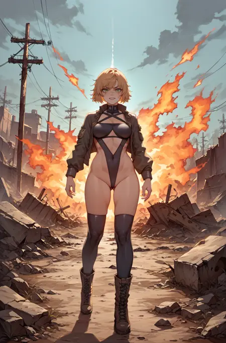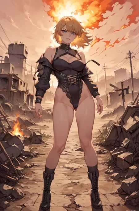 (laceoutfits, nsfw, 2D):1.6,cameltoe,score_9,score_8_up,score_7_up,1woman,solo,best quality,highres,masterpiece,wasteland,nomadland,burning shrines,crumbling churches,faith collapses,(dynamic pose:0.2),scar on face,