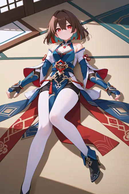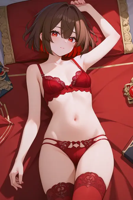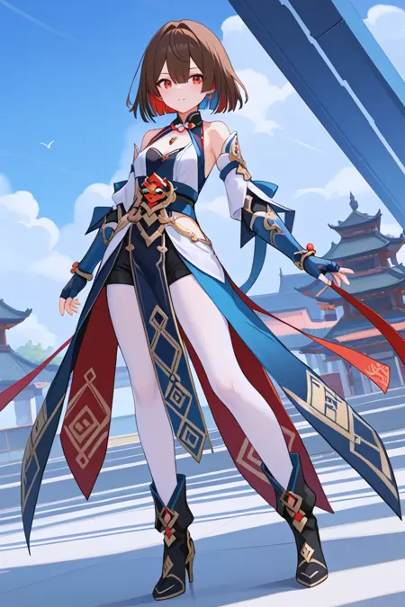 XueyiBren, bob cut, 1girl, brown hair, short hair, red eyes, hair between eyes, colored inner hair, petite, small breasts, inexpressive, tall female