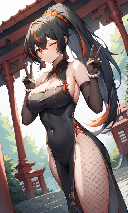 外見:朱元、オレンジ色の目、黒髪、長い髪、ストライプ入りの髪、ポニーテール