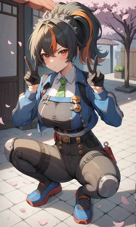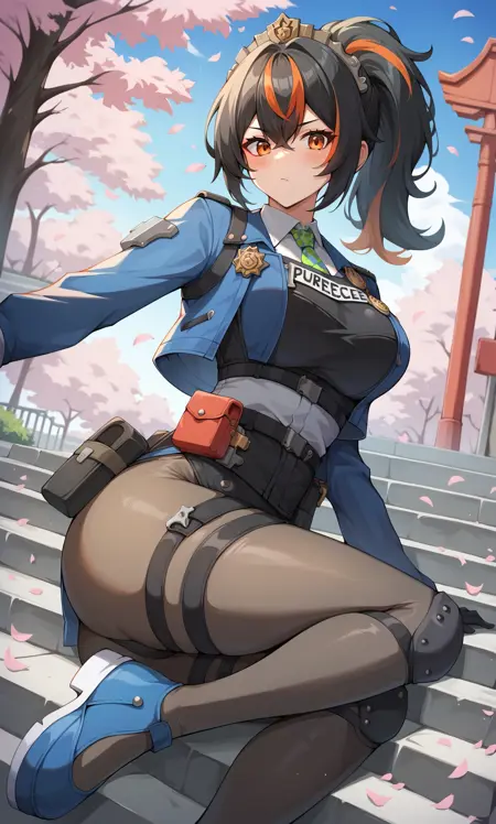 服装:メタルヘアバンド、警察官の制服、青いジャケット、短めのジャケット、長袖、黒いベスト、ツートーンのベスト、黒い手袋、緑のネクタイ、チェック柄のネクタイ、黒いズボン、ハイウエストのズボン、ベルト、太ももストラップ、膝パッド、ホルスター、ぴったりしたズボン、青い靴