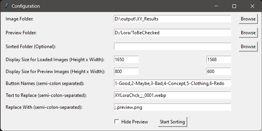 这是一个简单的 Python 程序,用于加载两个文件夹中的图像(一个存放输出图像,另一个存放 LoRA 或检查点的预览图像),并逐张显示。当每张图像显示时,您可以在右侧看到若干可配置的选项(默认绑定快捷键 1-6 和 z 键用于撤销),这些选项用于将图像移动到与按钮同名的子文件夹中。在浏览完所有图像后,您可以利用这些已分类的图像来决定后续的整理步骤。