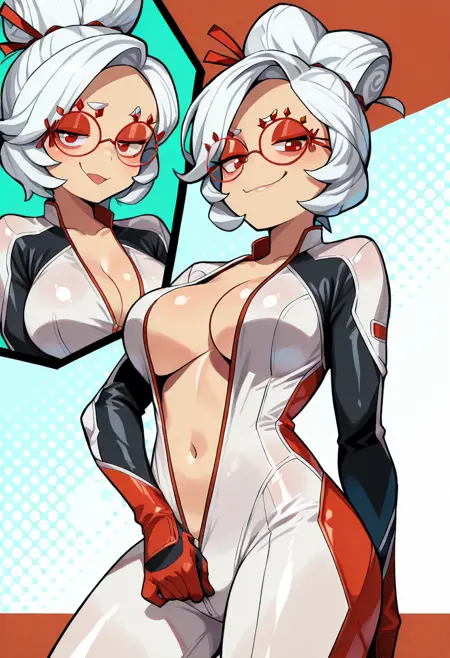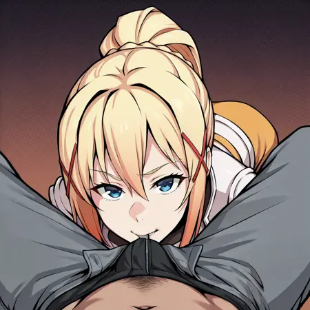 cleavage, navel, breasts, nipples, aerola slip, partially unzipped, clothing pull,