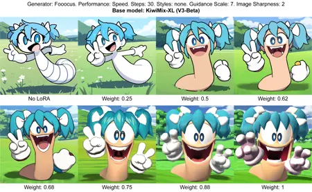 - 少数の病気のワームを追加したが、その結果、何かを「緑色」に指定するとワームの肌が緑色になってしまう予期せぬ副作用が発生した。「緑色の肌」をネガティブプロンプトに追加すると改善される可能性がある。