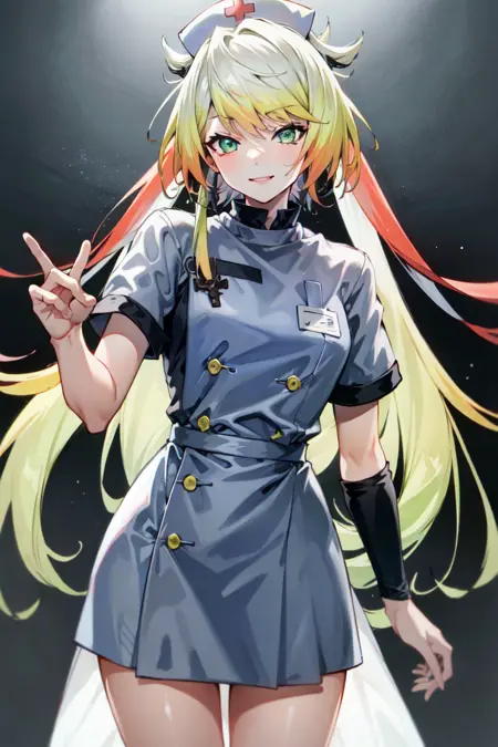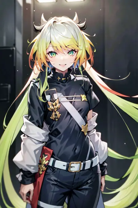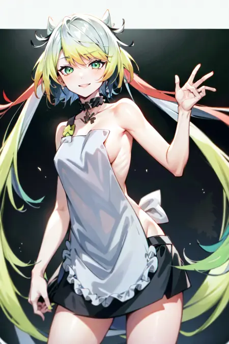 MelissaKinrenka、長い髪、金髪、ツインテール、緑の目、カラフルな髪、グラデーションヘア、小さな胸、中性的
