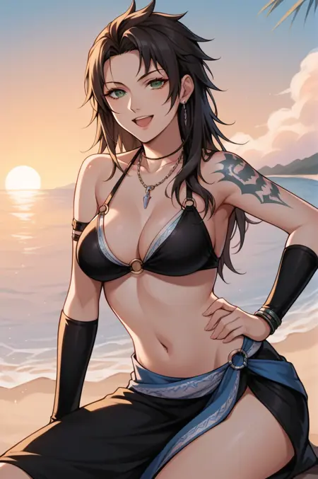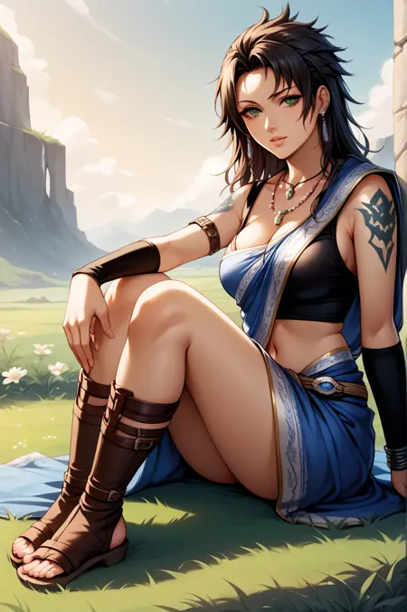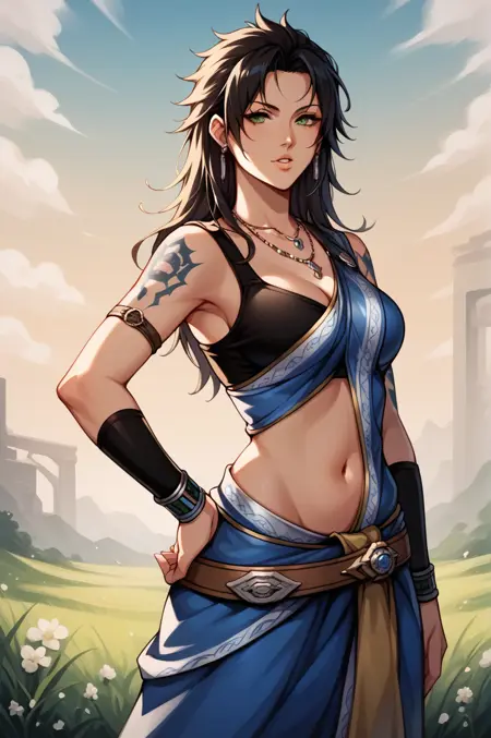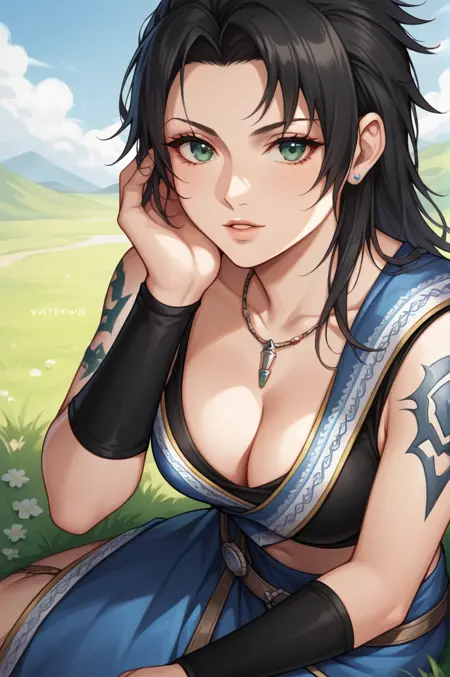"FangFFXIII,necklace, earrings, blue sari, arm warmers, shoulder tattoo, sandals"