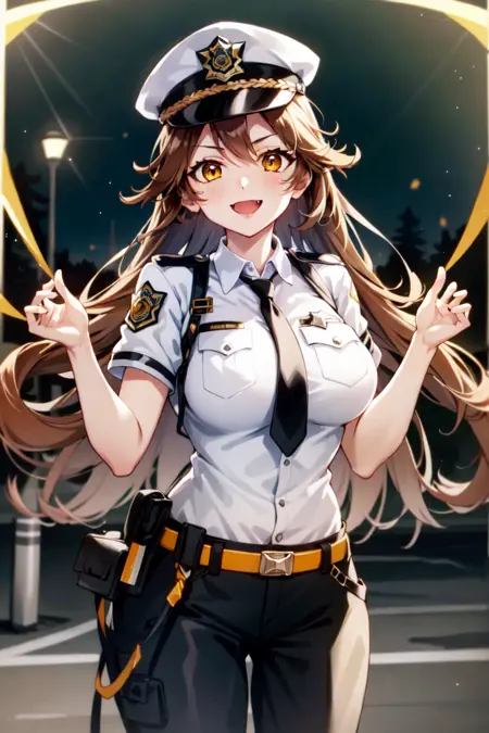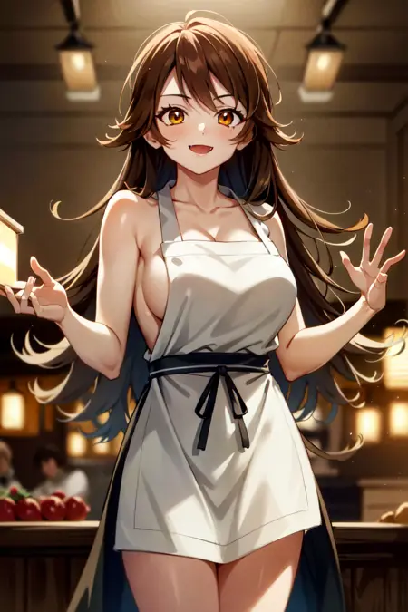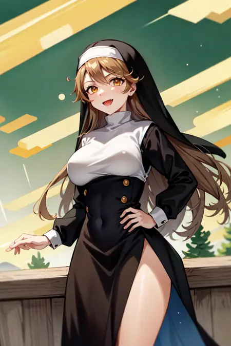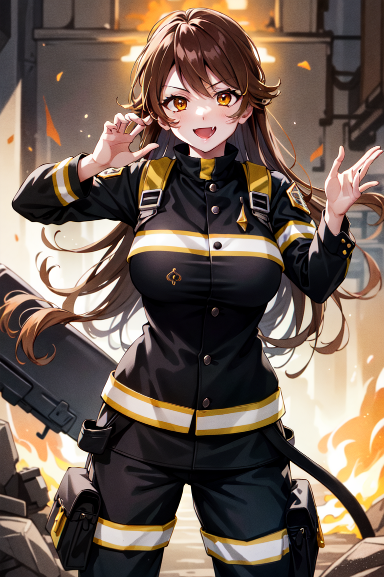 ShishiLeo, 긴 머리카락, 큰 가슴, 갈색 머리카락, 송곳니, 주황색 눈