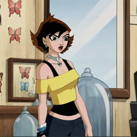 - トリガー:janetemh, 1girl, blue eyes, short hair, choker, bare shoulders, black hair, off shoulder, jewelry, necklace, multicolored hair, brown hair, retro artstyle