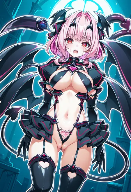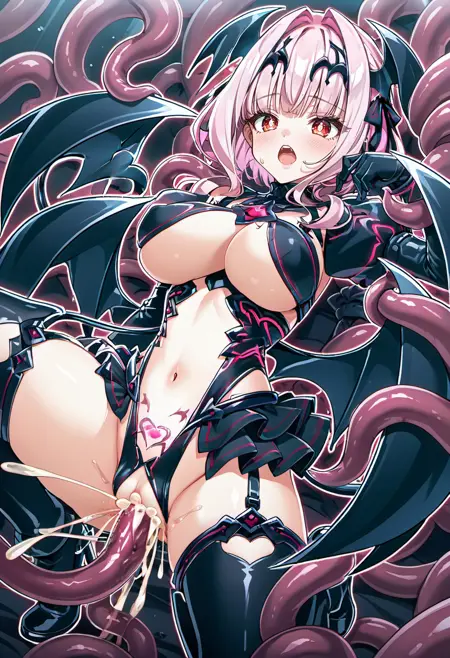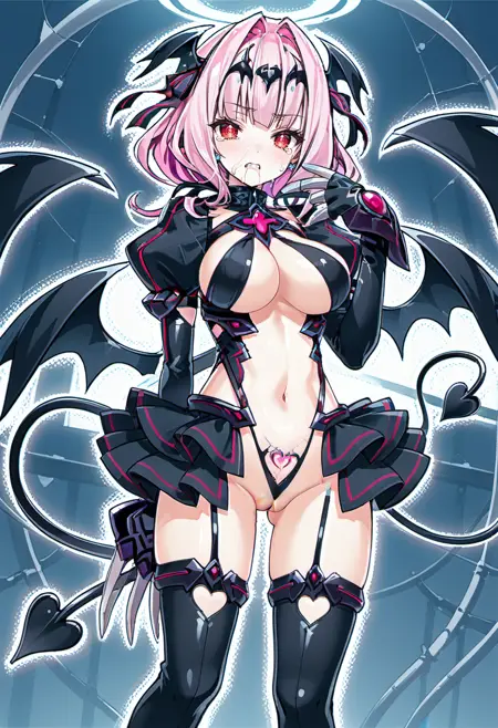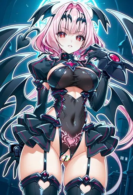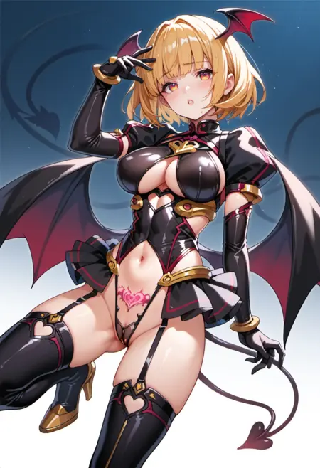 Liberator-Azarin,过膝袜,高跟鞋,手套,恶魔尾巴,翅膀,尾巴,黑色过膝袜,靴子,黑色手套,发带,肘部手套,阴部纹身,紧身衣,服装镂空,恶魔翅膀,黑暗人格,低垂翅膀,服装镂空,吊袜带,蓬松袖子,高开叉,黑色裙子