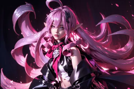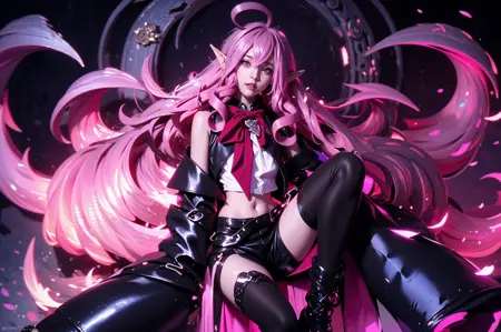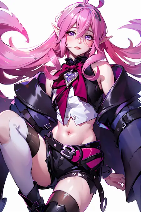 프롬프트 Keera:Keera_AoV, 1girl, solo, long hair, very long hair, bangs, pink hair, ahoge, hair between eyes, jewelry, pointy ears, looking at viewer, purple eyes, parted lips, bare shoulders, jacket, coat, open coat, heart, bow, pink bow, sleeves past wrists, sleeves past fingers, long sleeves, midriff, navel, shorts, belt, black shorts, thighhighs, boots, black footwear, realistic