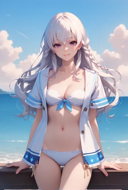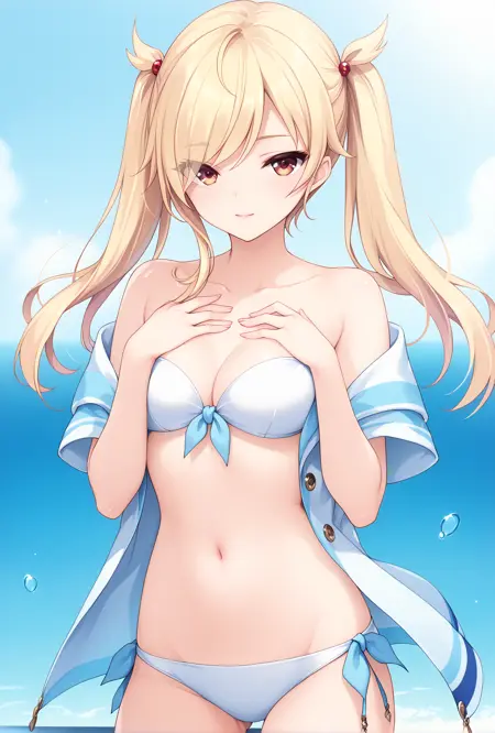 prmpt: moonfire swimsuit, front-tie bikini top, side-tie bikini bottom, open clothes,white bikini,