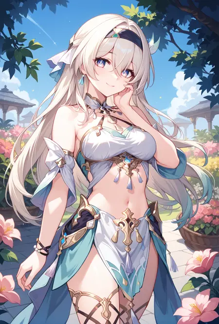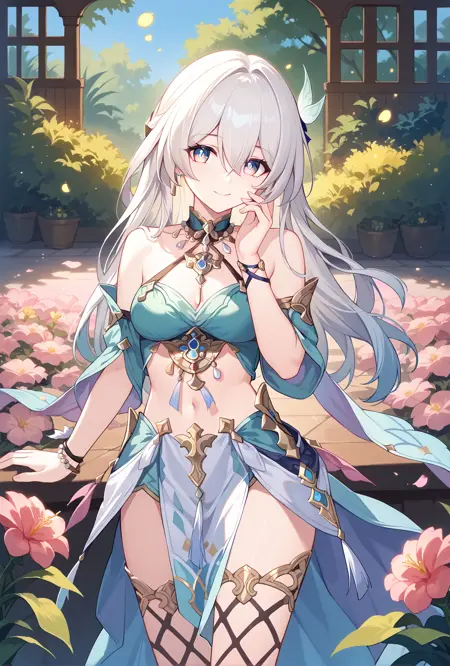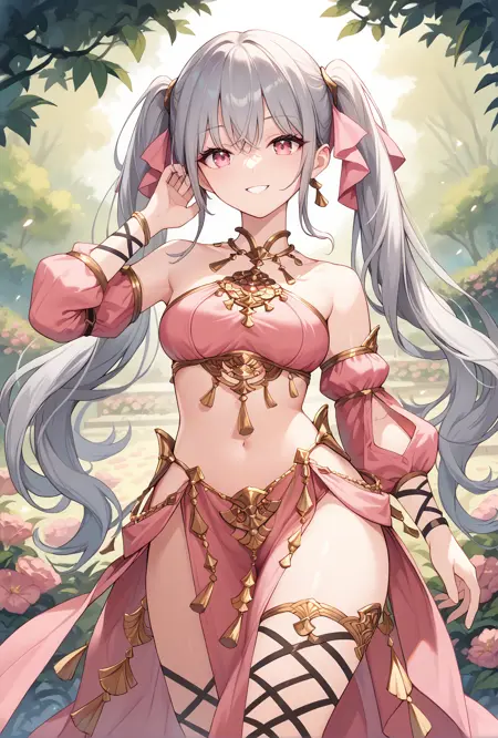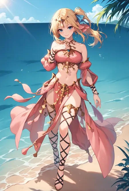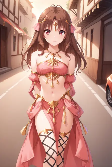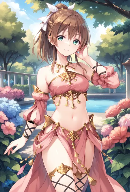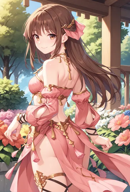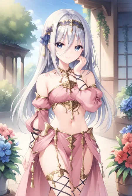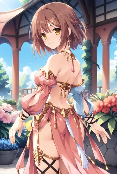 프롬프트: 댄서, 밴도, 골반 커튼, 분리형 소매, 할터넥 목걸이, 십자 끈