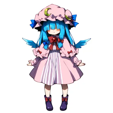 mahoko, blue hair, wings, hood, hair over eyes, hood up, capelet, gem, purple footwear, blunt bangs